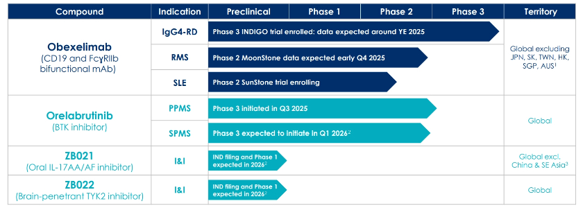 目前,奥布替尼已在进行一项全球多中心、随机双盲对照3期研究,用于治疗原发性进展型多发性硬化症(PPMS)。10月9日上午,界面新闻从公司业务沟通会上了解到,诺诚健华团队将与Zenas交接该部分研究。另外,Zenas计划于2026年第一季度启动第二项3期研究,用于治疗继发性进展型多发性硬化症(SPMS),并在2026年将本次获得的IL-17抑制剂、TYK2抑制剂推进到临床阶段,且在2027年获得IL-17抑制剂的初始患者数据。