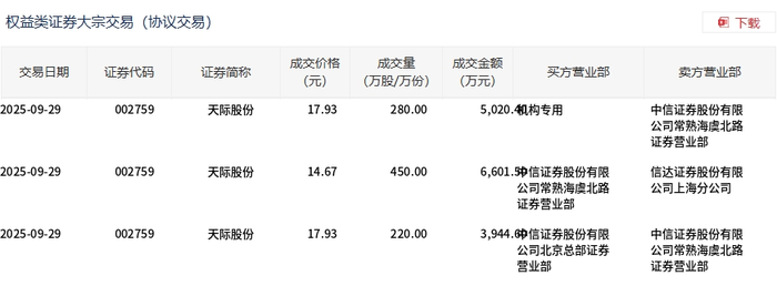 9月29日,天际股份大宗交易成交950万股,成交额1.56亿元,占当日总成交额的16.48%,成交均价16.39元,较市场收盘价17.93元折价8.61%,其中最高成交价17.93元,最低成交价14.67元。