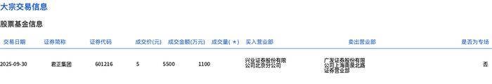 9月30日,君正集团大宗交易成交1100万股,成交额5500万元,占当日总成交额的13.41%,成交价5元,较市场收盘价5.23元折价4.4%。